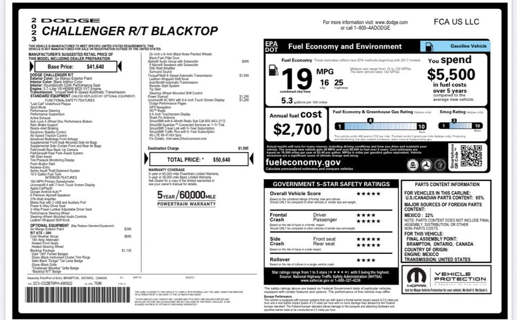 Go Mango 2023 Dodge Challenger R/T RWD 8-Speed Automatic HEMI 5.7L V8 Multi Displacement VVT