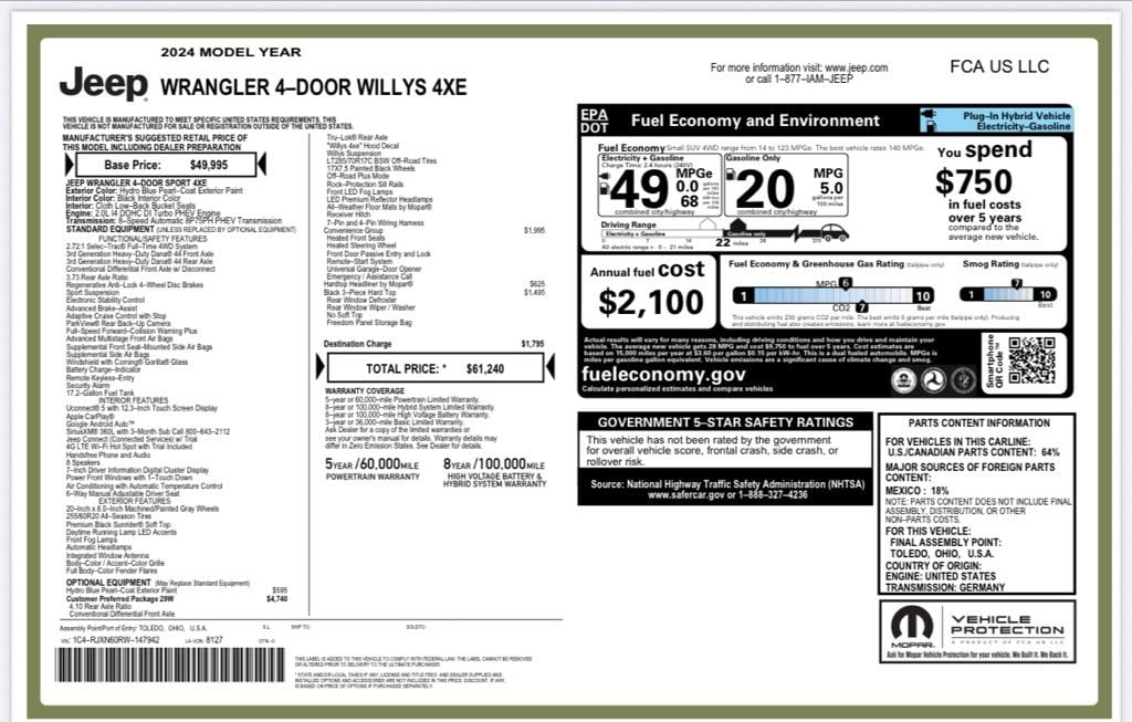 Hydro Blue Pearl Coat 2024 Jeep Wrangler Willys 4xe 4WD 8-Speed Automatic 2.0L I4 DOHC 2.0L I4 DOHC.