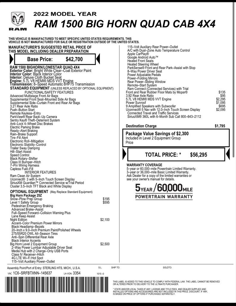 Bright White Clearcoat 2022 Ram 1500 Big Horn/Lone Star 4WD 8-Speed Automatic HEMI 5.7L V8 Multi Displacement VVT